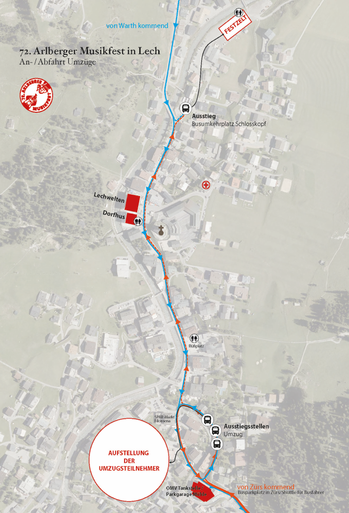 Es folgt der Marsch durch das Ortszentrum von Lech in Richtung Festzelt (ca. 900m).